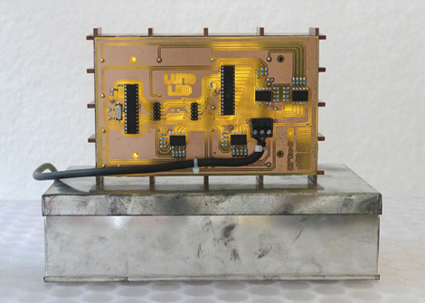 Media: Phenolic resin, acryl glass, LEDs, printed circuit board, various electronics, microcontroller, software