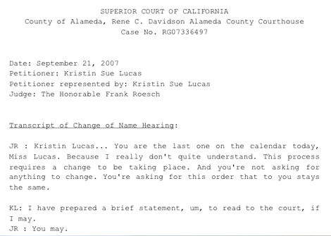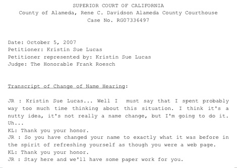 On October 5, 2007 Kristin Lucas succeeded in legally changing her name from Kristin Sue Lucas to Kristin Sue Lucas. In Alameda County Court, the presiding judge who granted the request said: "So you have changed your name to exactly what it was before in the spirit of refreshing yourself as though you were a web page."